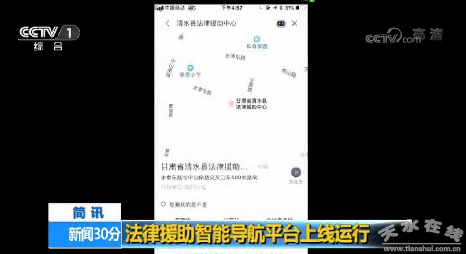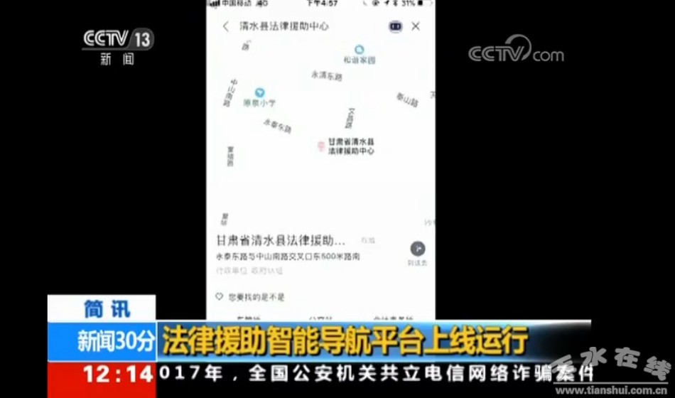 3月10日,全国两会司法部新闻发布会上,在介绍法律援助智能导航平台上线运行过程中,清水县法律援助中心作为其中一个例子进行展播。CCTV13新闻频道发布会直播及CCTV1新闻30分中进行了播出。