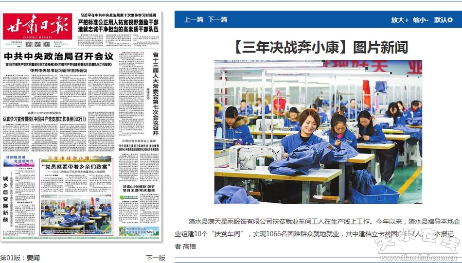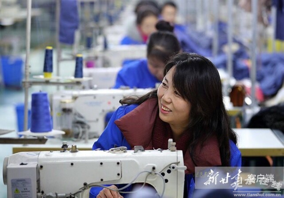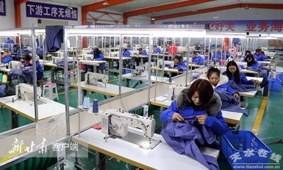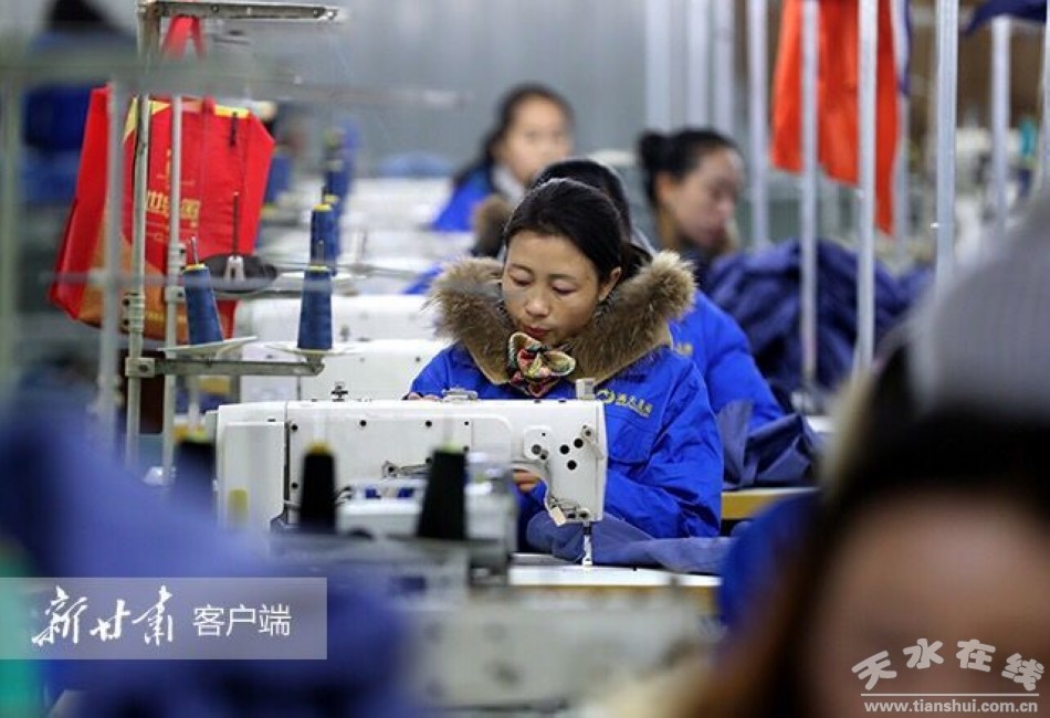 (11月27日甘肃日报头版图片新闻:清水县满天星雨服饰有限公司扶贫就业车间工人在生产线上工作。今年以来,清水县指导本地企业组建10个“扶贫车间”,实现1066名困难群众就地就业,其中建档立卡贫困户667人。)