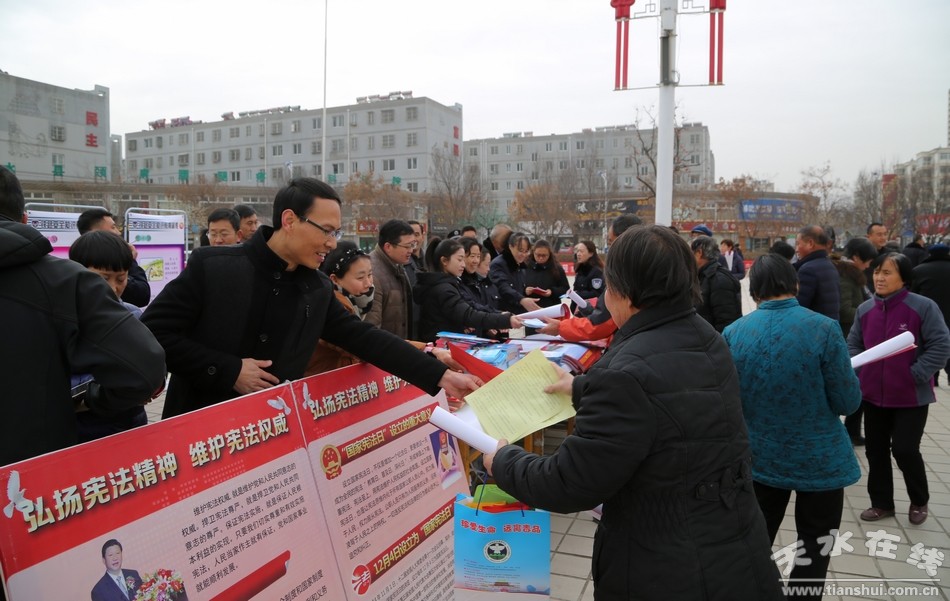 12月4日是第五个国家宪法日,清水县2018年“宪法宣传周”启动仪式在轩辕广场举行,旨在深入学习习近平总书记全面依法治国新理念新思想新战略,全面贯彻落实中央、省、市关于深入学习宣传宪法的部署,切实推动宪法宣传教育和“七五”普法规划目标任务全面落实,在全县营造尊法、学法、守法、用法的浓厚氛围,为推进“法治清水”、“平安清水” 建设提供更加优质的法律服务保障。