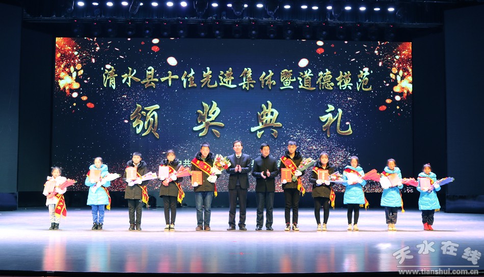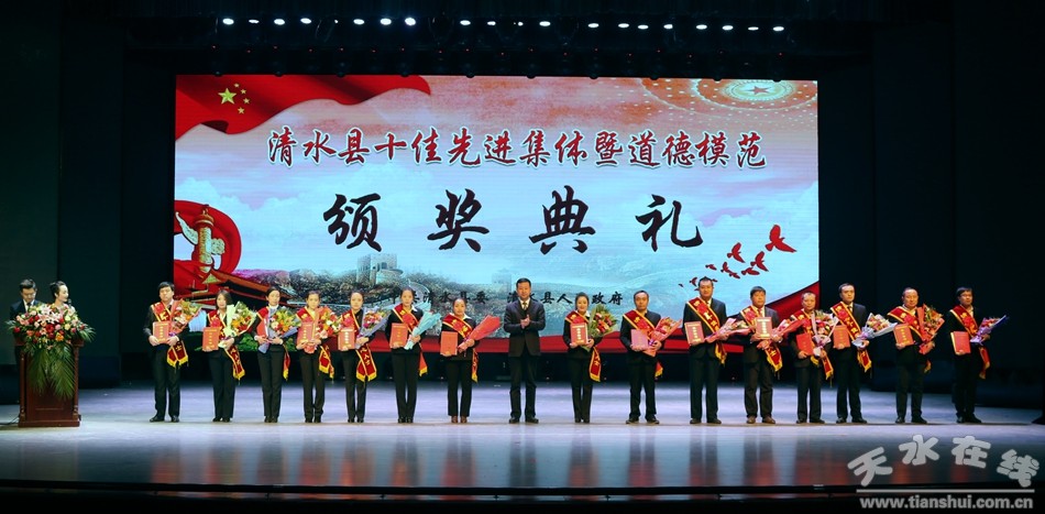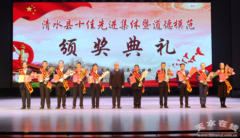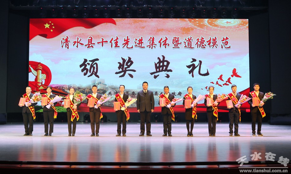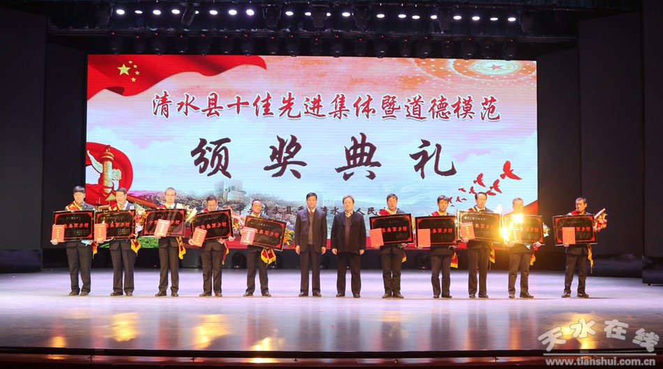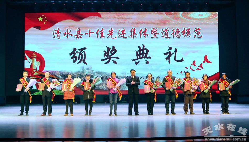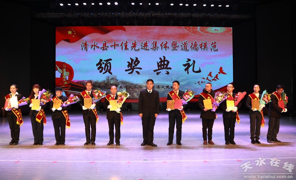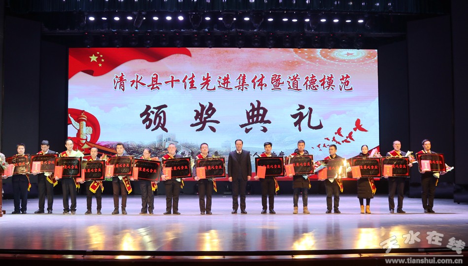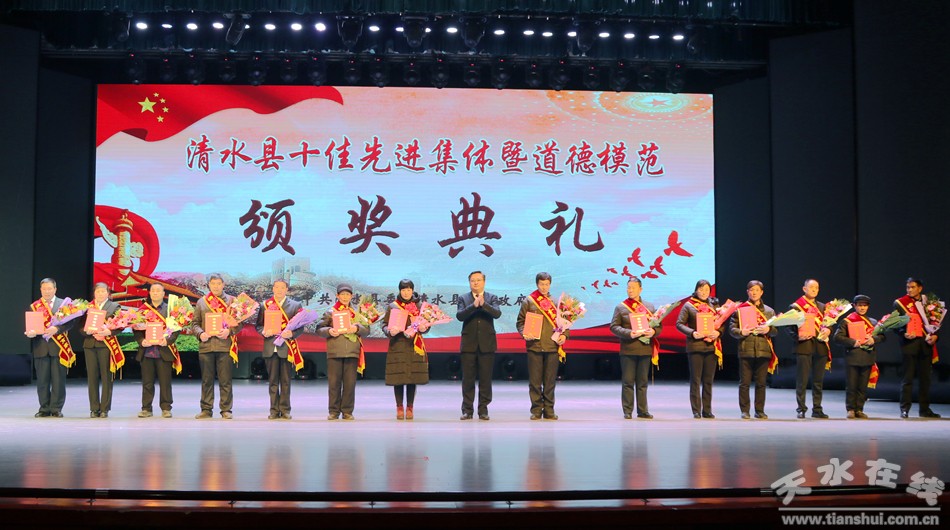 1月18日下午,清水县隆重举行2018年度十佳先进集体暨道德模范颁奖典礼,对评选出的十佳劳动模范、十佳清水好人、十佳平安卫士、十佳电商先锋、十佳最美教师、十佳医护楷模、十佳诚实守信模范、十佳重视教育家庭、十佳爱心人士(企业)、十佳贤惠媳妇、十佳孝心少年、十佳最美退役军人、十佳美丽乡村、十佳文明校园、十佳文明家庭进行隆重表彰,激励全县党员干部群众以先进典型为榜样,锐意进取、攻坚克难,以更加奋发有为的精神状态投身到打赢脱贫攻坚战、实施乡村振兴战略、建设幸福美好新清水的火热实践。