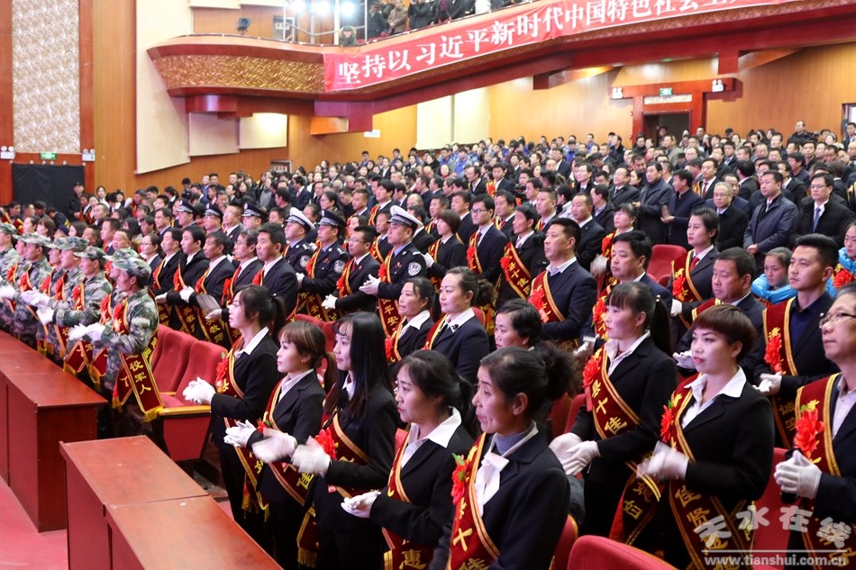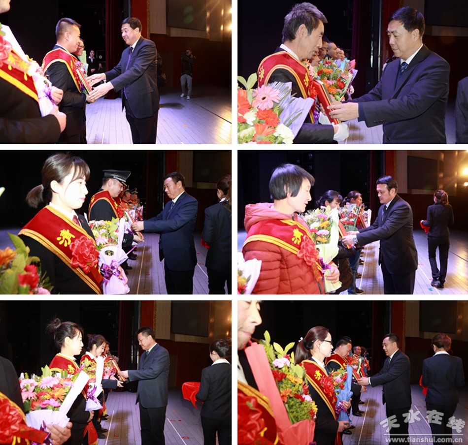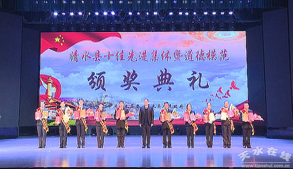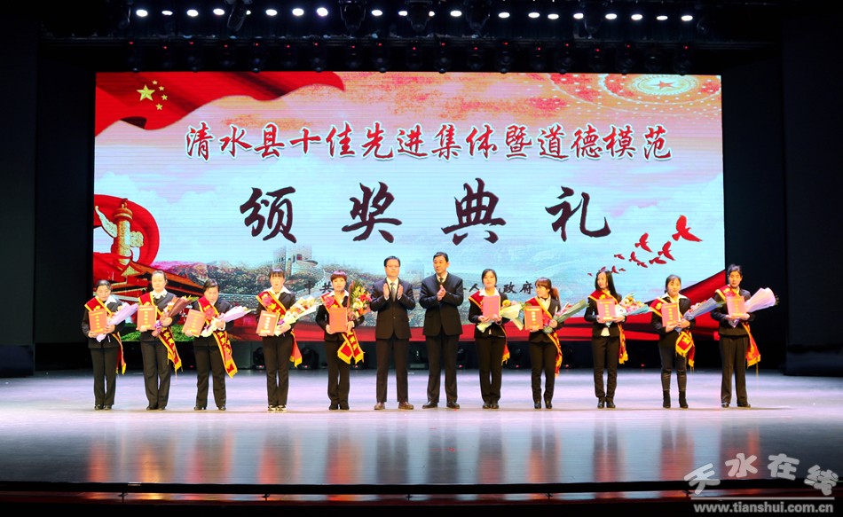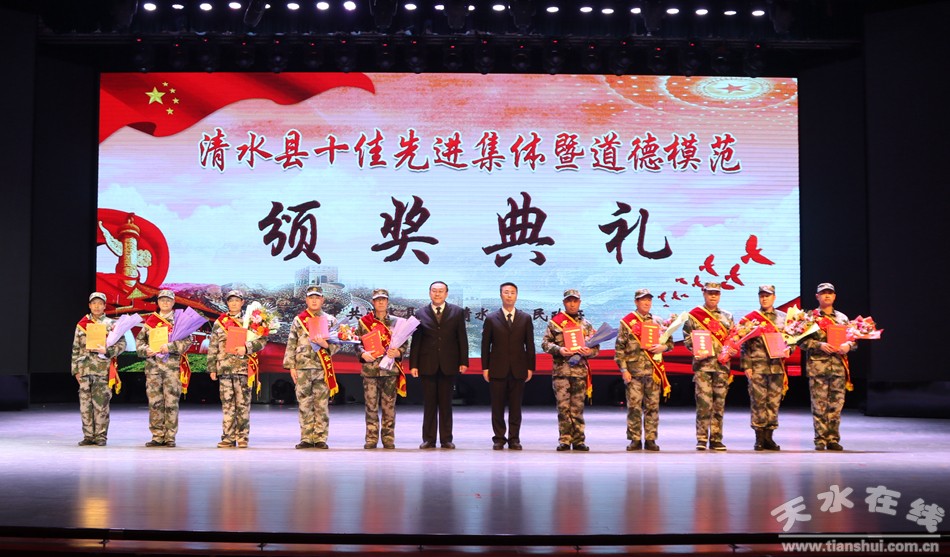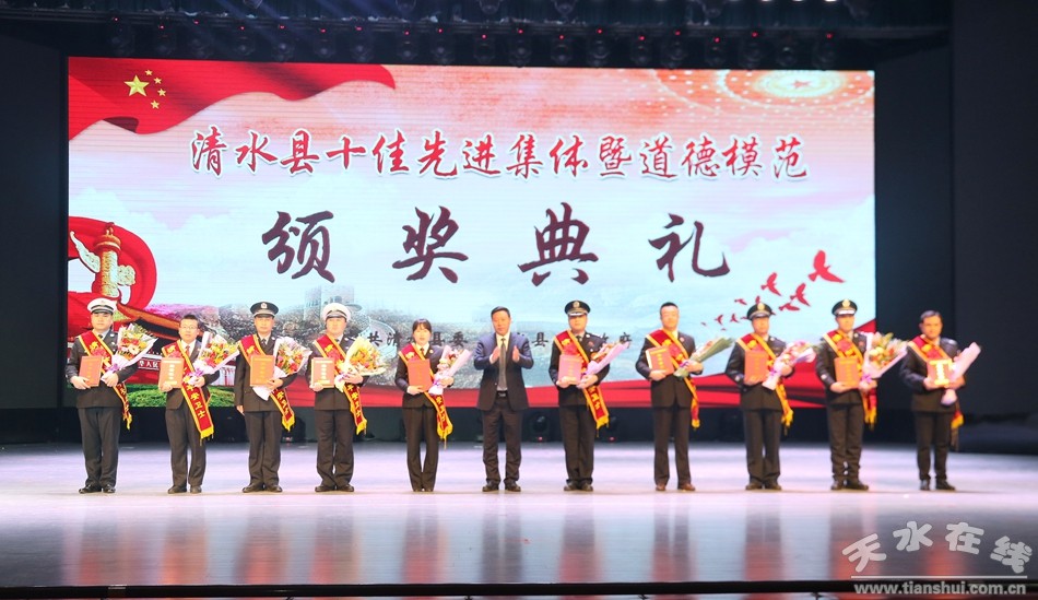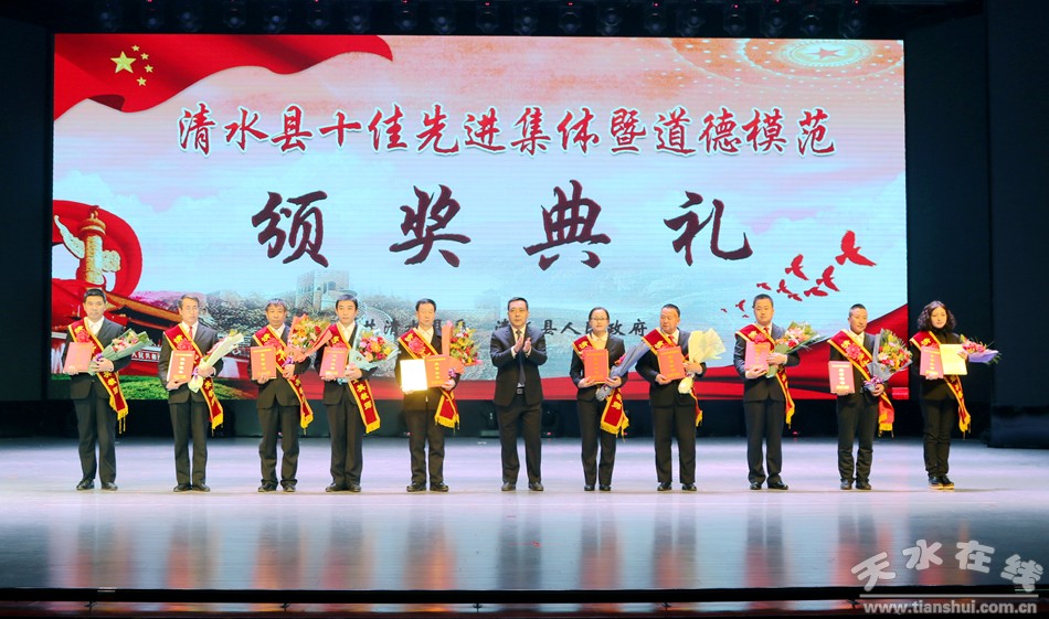 1月18日下午,清水县隆重举行2018年度十佳先进集体暨道德模范颁奖典礼,对评选出的十佳劳动模范、十佳清水好人、十佳平安卫士、十佳电商先锋、十佳最美教师、十佳医护楷模、十佳诚实守信模范、十佳重视教育家庭、十佳爱心人士(企业)、十佳贤惠媳妇、十佳孝心少年、十佳最美退役军人、十佳美丽乡村、十佳文明校园、十佳文明家庭进行隆重表彰,激励全县党员干部群众以先进典型为榜样,锐意进取、攻坚克难,以更加奋发有为的精神状态投身到打赢脱贫攻坚战、实施乡村振兴战略、建设幸福美好新清水的火热实践。