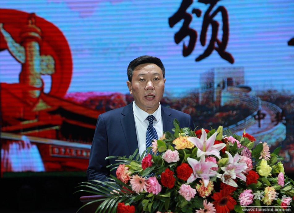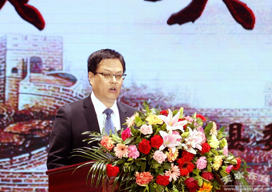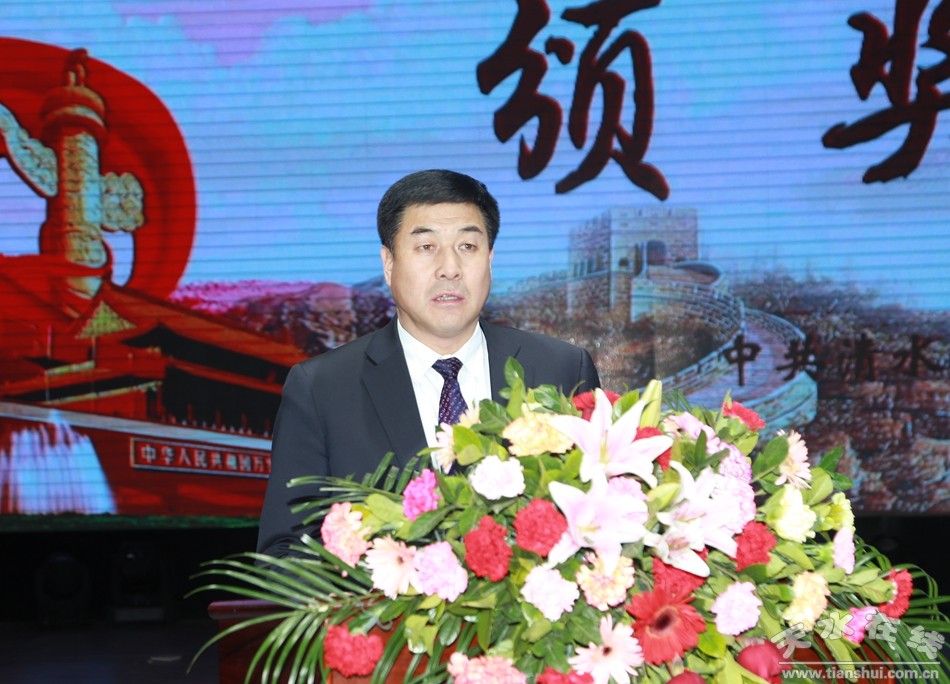 市人大常委会副主任、清水县委书记刘天波作了致辞。他首先代表县四大组织,向十佳先进集体和道德模范表示热烈祝贺和崇高敬意!向全县33万父老乡亲和辛勤奋战在各条战线上的同志们致以亲切问候。