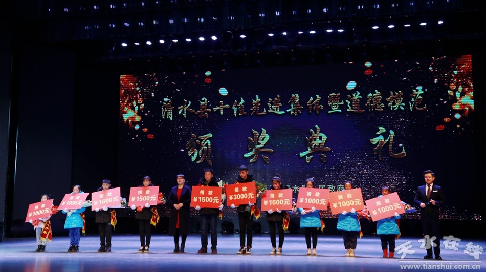 1月18日下午,清水县隆重举行2018年度十佳先进集体暨道德模范颁奖典礼,对评选出的十佳劳动模范、十佳清水好人、十佳平安卫士、十佳电商先锋、十佳最美教师、十佳医护楷模、十佳诚实守信模范、十佳重视教育家庭、十佳爱心人士(企业)、十佳贤惠媳妇、十佳孝心少年、十佳最美退役军人、十佳美丽乡村、十佳文明校园、十佳文明家庭进行隆重表彰。