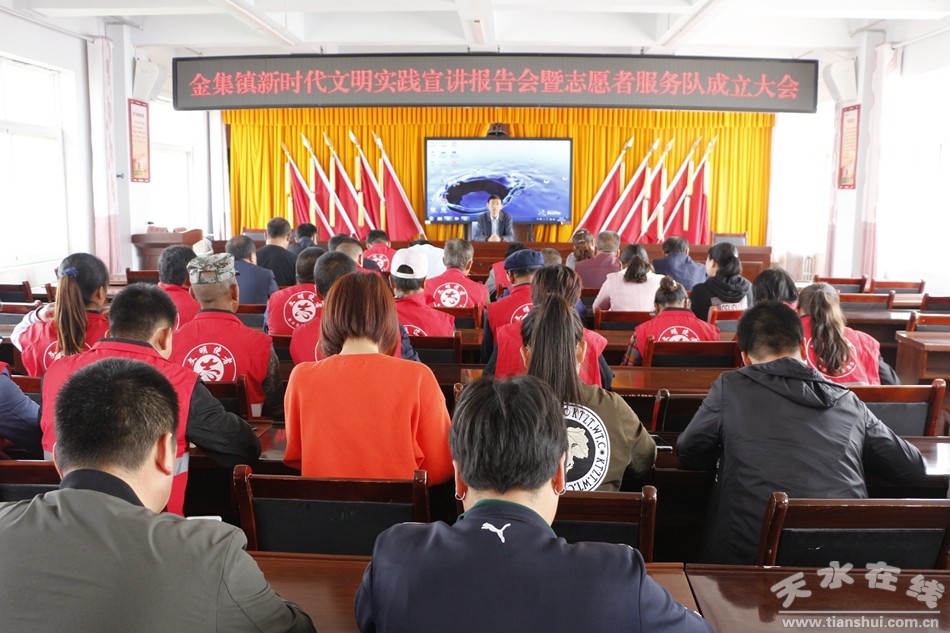 近日,清水县金集镇召开新时代文明实践首场宣讲报告会暨志愿者服务队成立大会。吹响了金集镇全面开展新时代文明实践活动的集结号。金集镇通过推进“五个一”建设,着眼于凝聚群众、引导群众,以文化人、成风化俗,调动各方力量,整合各种资源,创新方式方法,全面提高干部群众思想政治素质、提升道德文化素养、增强精神动力,打通宣传群众、服务群众、教育群众、关心群众“最后一公里”,推进新时代文明实践活动落地生根、开花结果。
