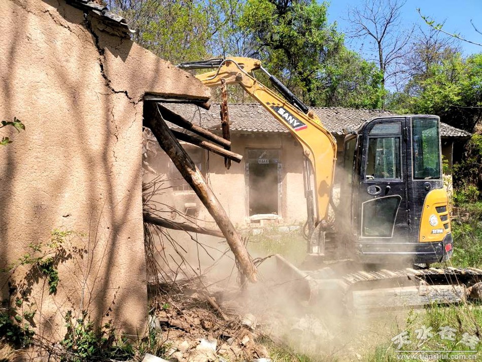 丰望乡磨上咀是整体搬迁村,搬迁以后,老村的危旧房成为村两委班子的一块心病,危旧房即影响人居环境,还存在安全隐患,为了彻底拆除危房,磨上咀按照乡党委、政府的要求,对危旧房进行了再次排摸,把危旧房拆除按照户数包户到人,但老屋存有太多的生活记忆,村民们一直不舍拆除。为了顺利拆除危旧房,磨上咀两委班子成员、驻村帮扶工作队逐户进行政策宣传,经过不厌其烦的宣传动员,磨上咀搬迁户全部同意拆除危旧房,并对宅基地进行复垦复绿,不断美化和提升农村人居环境。在磨上咀村,记者看到拆除危旧房的挖掘机正在热火朝天的拆除老屋,而且对已经拆除完的正在进行平整栽树植绿。