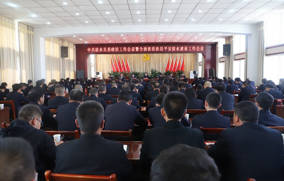 县委、县政府分管领导,法院院长、检察院检察长、公安局政委;政法系统各单位班子成员及中层干部;平安清水建设领导小组、全面依法治县委员会成员单位主要负责同志;乡镇党委书记、政法委员参加会议。