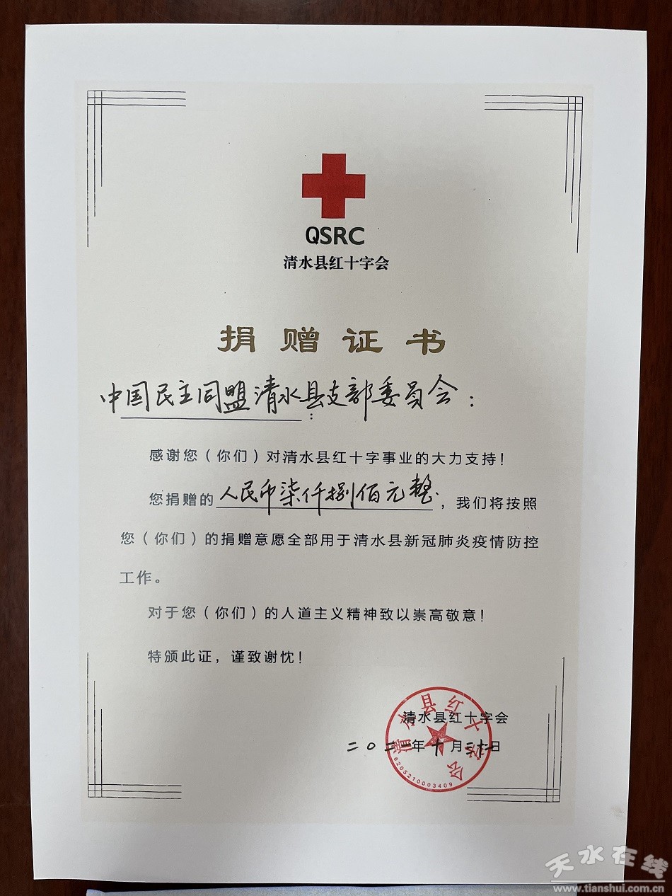 积极捐款,助力抗疫。在《民盟清水县支部关于为我县新冠疫情防控捐款倡议书》的号召下, 36位盟员慷慨解囊,共捐款7800元。民盟支部第一时间将善款捐至县红十字会账户,发扬了“集小善成大爱”的民盟精神。