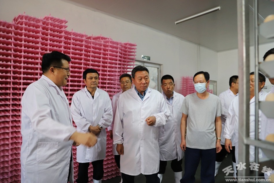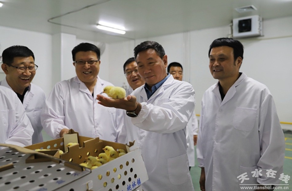 马越垠一行先后参观了山东诸城外贸有限责任公司孵化场、研发中心、外贸展销中心、诸城外贸新厂项目建设现场、诸城莲春天然色素提纯车间等地,详细了解公司发展规模、生产经营、销售情况以及未来规划情况,着重了解肉鸡全产业链发展情况和万寿菊色素提纯工作。