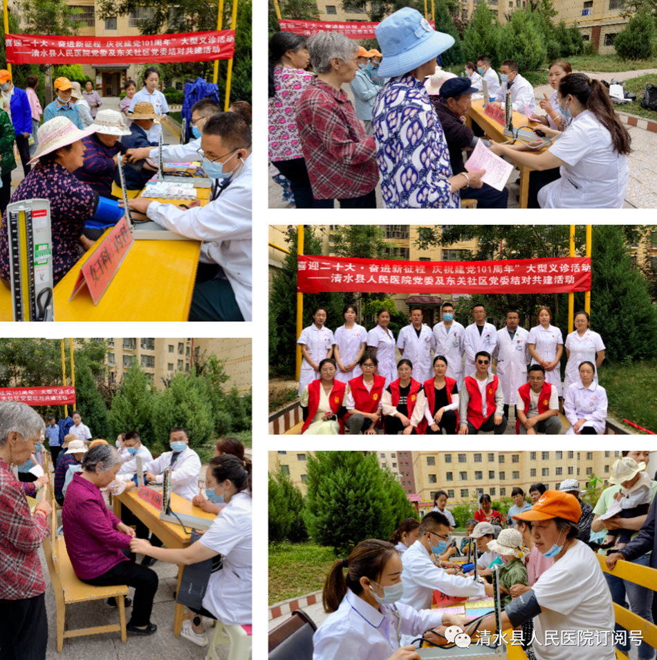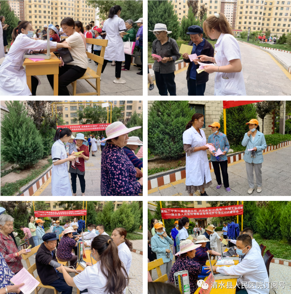 为隆重庆祝党的101周年华诞,6月25日上午,清水县医院党委与永清镇东关社区党委在东方铭城小区联合举办了结对共建庆祝建党101周年大型义诊活动。医院组织中西科、内科、康复科、普外科、骨科、妇产科等学科专业10名骨干,免费为东方铭城及周边小区的群众测量血压,进行健康筛查,开展健康及疫情防控知识宣教。