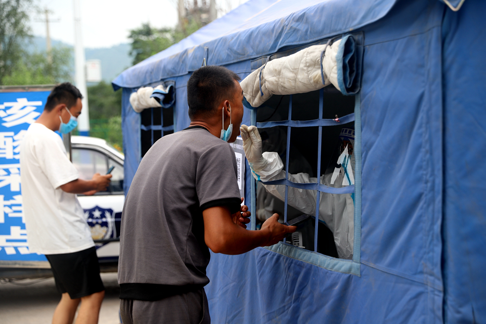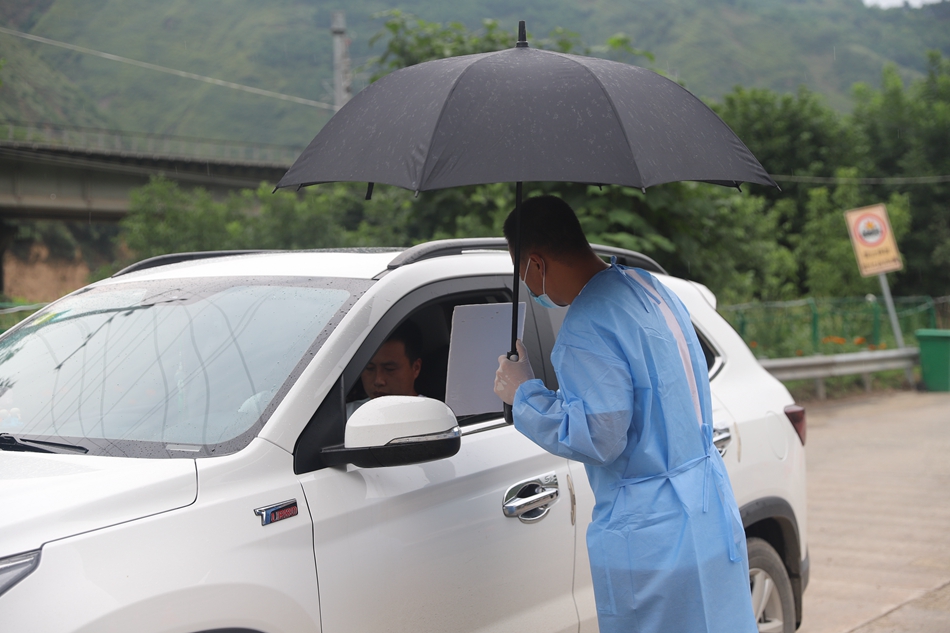 “请出示健康码和行程码……”唐杨卡口的工作人员手持雨伞,身着隔离服,在对来往车辆和人员逐一进行排查。尽管隔离服里的衣服已经湿透,脸被晒得通红,大颗的汗珠往下滴,但他们仍一丝不苟工作,做到“逢车必查、逢人必检”。