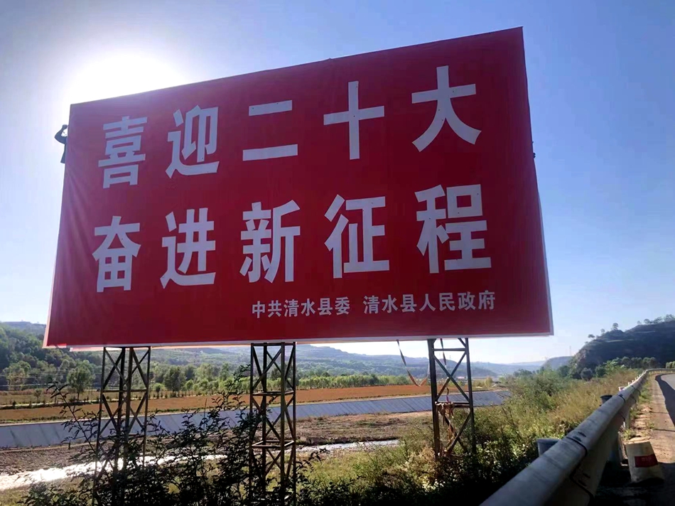 近日,清水县紧扣主题、统一规划、因地制宜,打造“喜迎二十大”主题景观,在大型户外广告牌、绿化带广告牌、户外电子屏、出租车LED、企业、单位布设喜迎党的二十大宣传标语,进一步激发广大党员干部群众爱党爱国、奋发奋斗的精神力量。