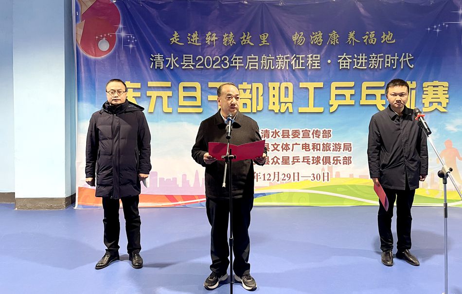 为持续推动全民健身和群众体育活动健康发展,调动广大乒乓球爱好者参与健身运动的极积性,展现全县干部职工乐观向上、积极进取的精神风貌。在元旦、春节即将来临之际,12月29日,清水县举办 2023 年“启航新征程·奋进新时代”庆元旦干部职工乒乓球赛。清水县委常委、宣传部部长马小平参加活动并致辞。