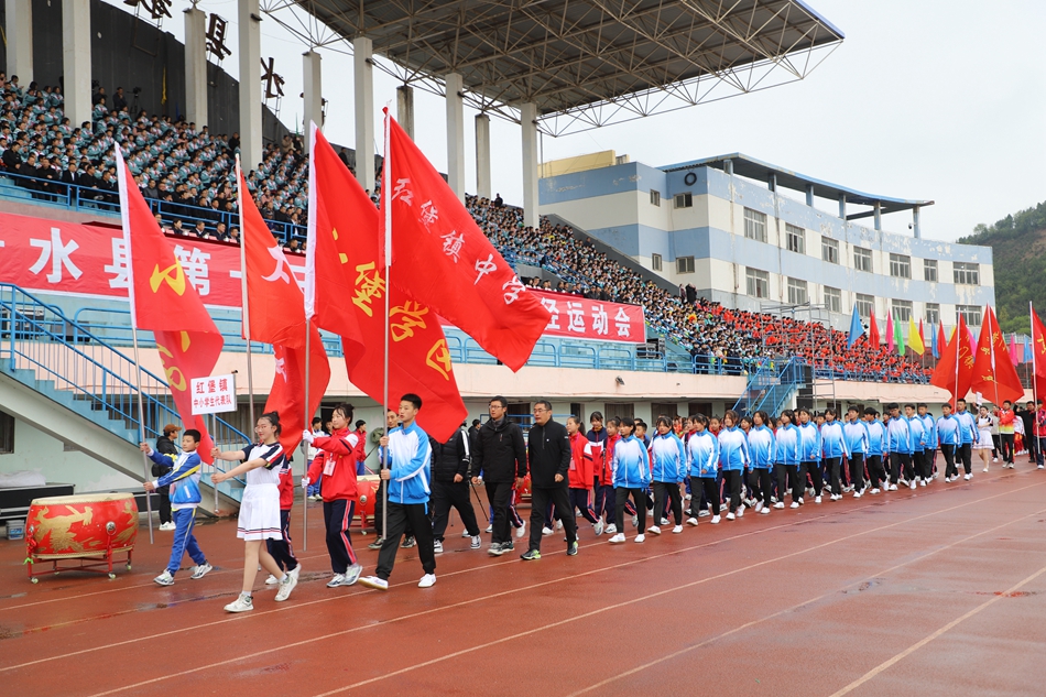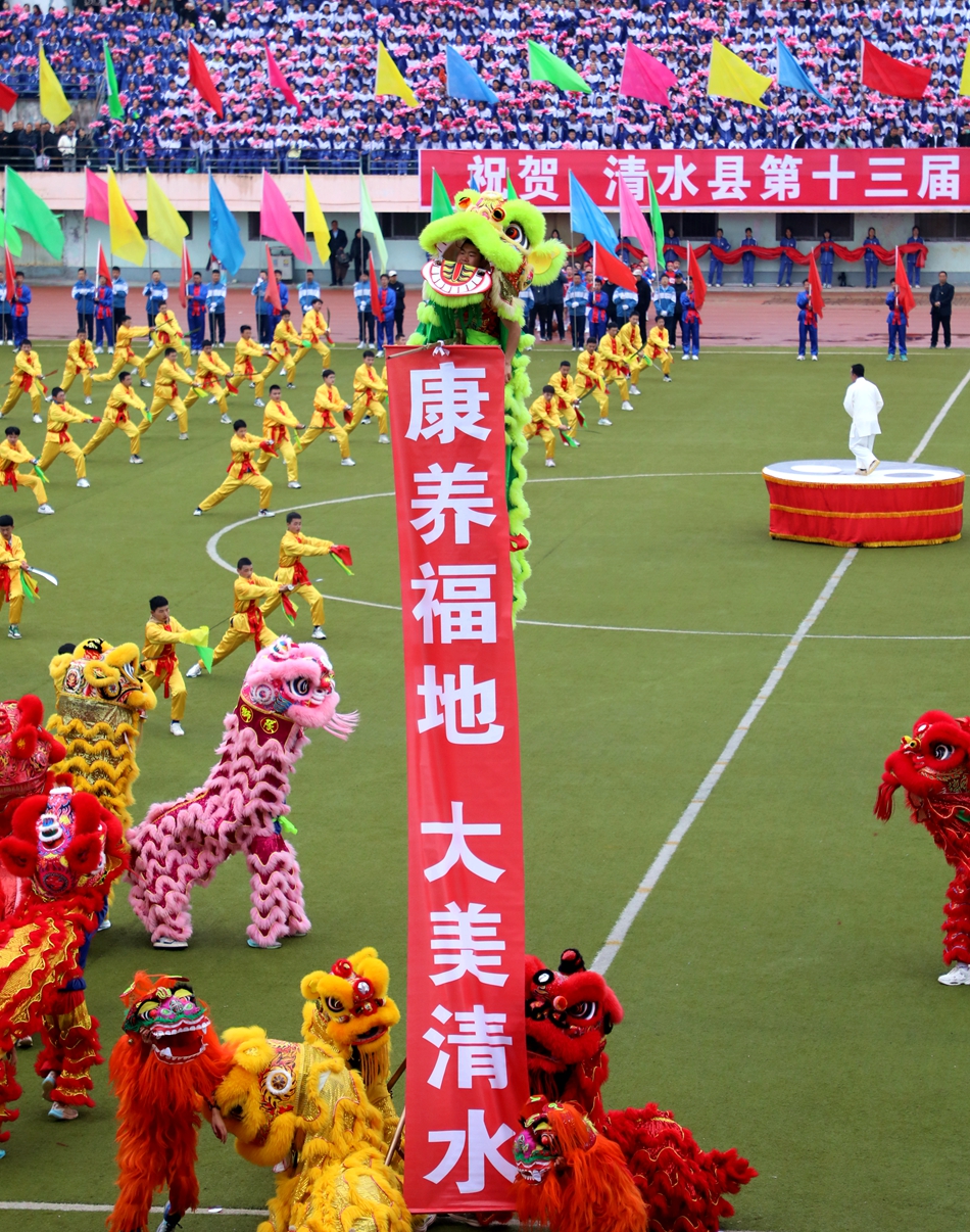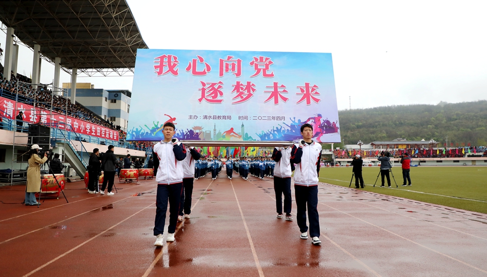 市委教育工委书记、市教育局党组书记杨瑞峰以及清水县四大组织领导李菊霞、丁旺喜、蔡俊杰等出席开幕式。来自全县各中小学的运动健儿意气风发,斗志昂扬,展示着飞扬的青春风采。在雄壮的运动员进行曲中,会徽、宣传牌、彩旗队、鼓号队、裁判员、运动员方阵精神抖擞,迈着坚定的步伐依次入场。