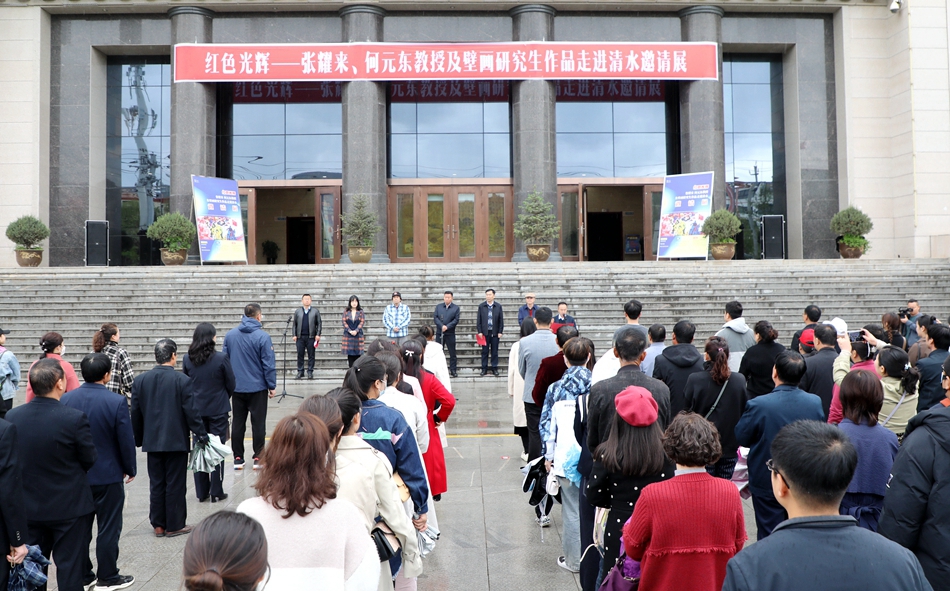 5月10日上午,红色光辉——张耀来、何元东教授及壁画研究生作品走进清水邀请展开展仪式在轩辕大剧院举行,这既是清水县全面落实乡村振兴战略,丰富干部群众精神文化生活,助力丁香文化旅游持续发展的重要活动,也是贯彻落实党的二十大精神,深化东西部文化交流协作,促进清水文化振兴的具体实践。