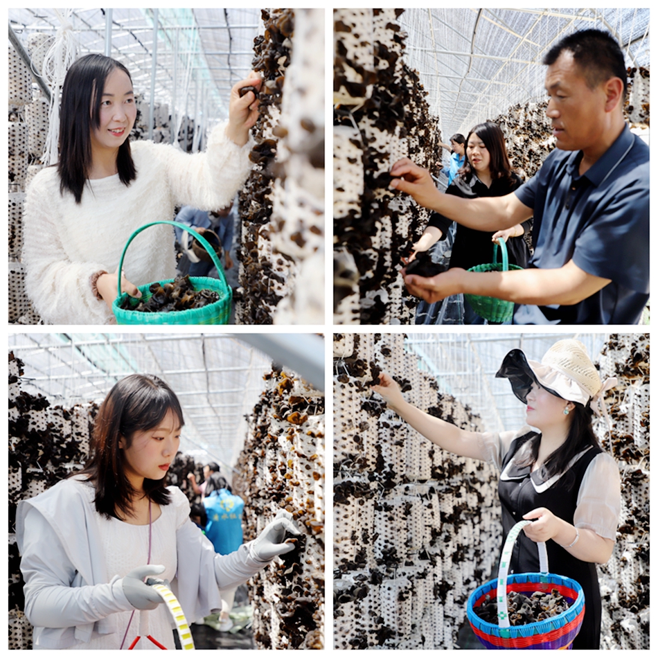 活动现场,圆柱状的菌袋一排排整齐地挂在棚里,形状各异、肥嘟嘟的黑木耳从遍布菌袋的小孔中探出头来,长势喜人,大家挑选成熟的木耳进行采摘。