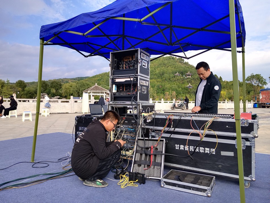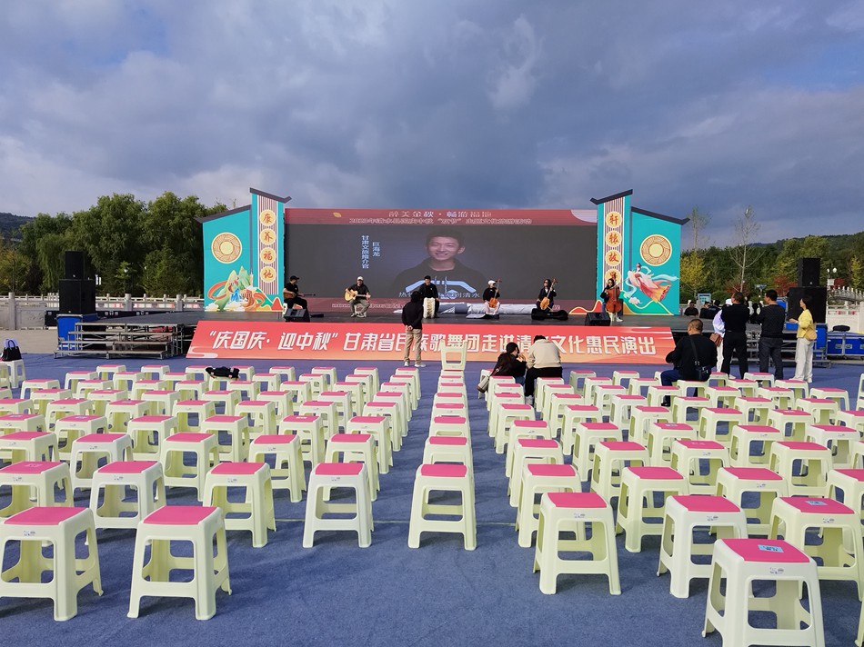 在轩辕湖公园,即将迎来的是9月26日举行的“庆国庆·迎中秋”甘肃省民族歌舞团走进清水文化惠民演出活动。来到现场,音响、灯光等设备已调试完成,台上演员们全神贯注进行彩排。台下工作人员正在摆放板凳、进行环境卫生保洁,为“双节”活动营造一个干净、有序的演出环境。
