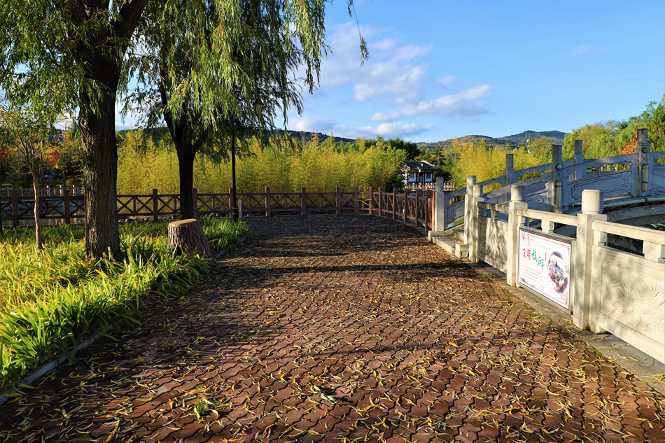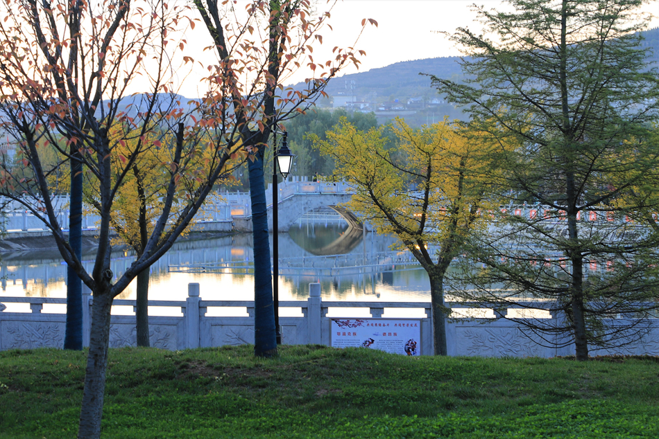走进轩辕湖公园,轩辕湖湖水宁静澄澈,与花草树木、走廊石桥、蓝天白云相映成趣,一幅色彩斑斓的美好画卷。