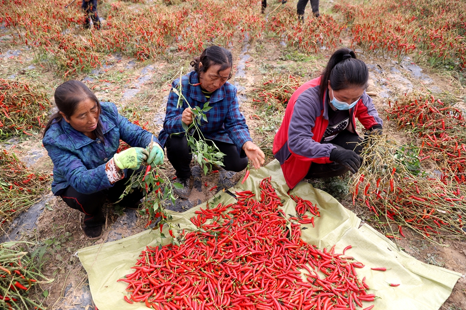 辣椒种植属于劳动密集型产业,从育苗、管护到成熟采摘,每个环节都需要大量的劳动力,李湾村的辣椒种植基地为在家劳动力提供了就业岗位。目前正值朝天椒采摘时间,更是吸引了周边众多村民前来务工,每人每天80元,村民们一边采摘一边谈笑,田间地头奏响了“火红”的乡村振兴“椒”响曲。