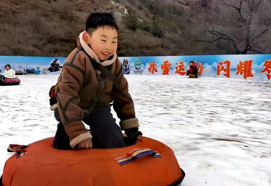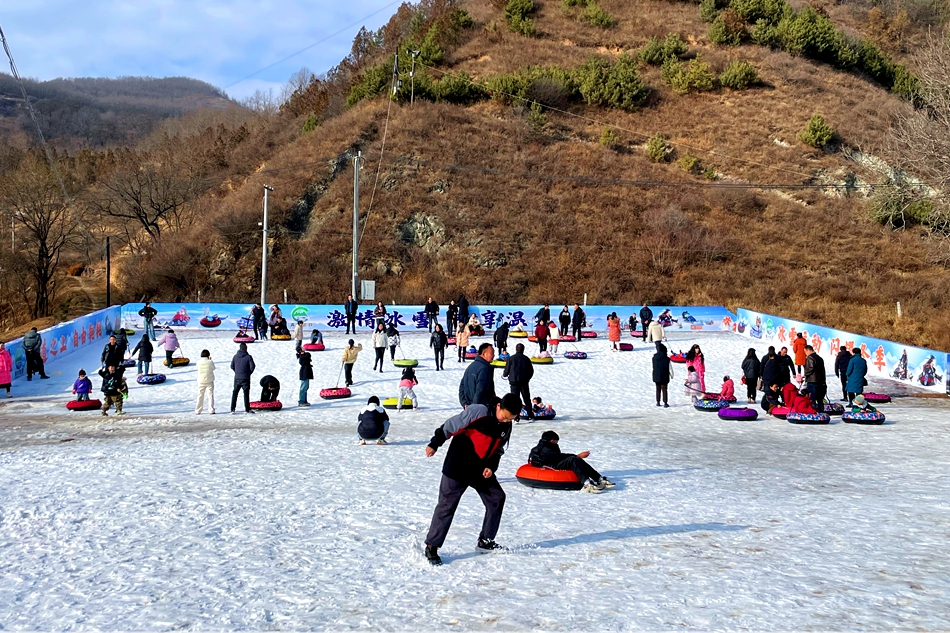 出了职工培训中心,一路往上走,经过汤峪温泉,便来到了温泉村上王庄。戏雪乐园滑雪场内一片银装素裹,孩子们坐在滑雪圈上,从雪坡上飞驰而下,尽情享受着冰雪运动带来的惊险刺激。