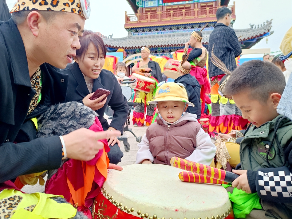 有“天下第一鼓”美誉的轩辕鼓是今日的“明星”,往来游客在观赏鼓舞后纷纷凑到鼓前尝试敲击,鼓手们也笑着向游客们讲解敲鼓的方法,场面一时其乐融融、分外温馨。