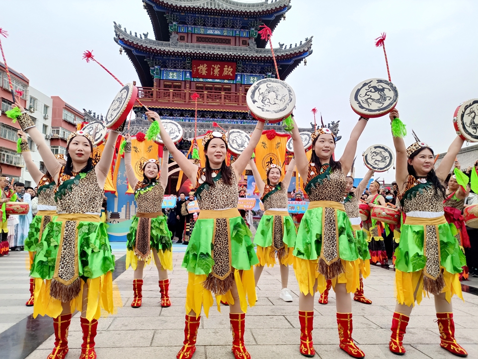 轩辕大鼓敲起来,轩辕旌旗摇起来,响亮铜镲击起来,清水儿女舞起来……