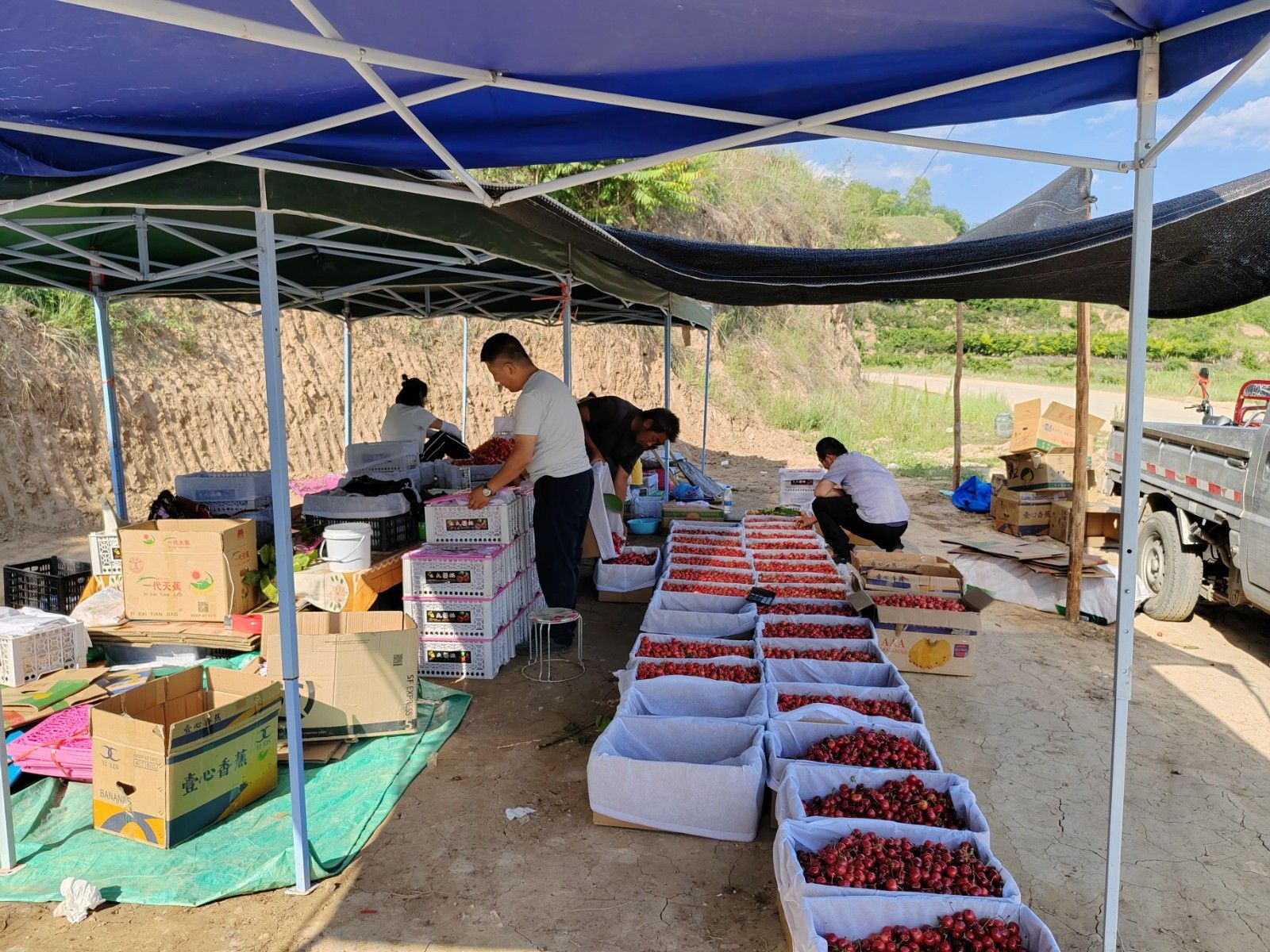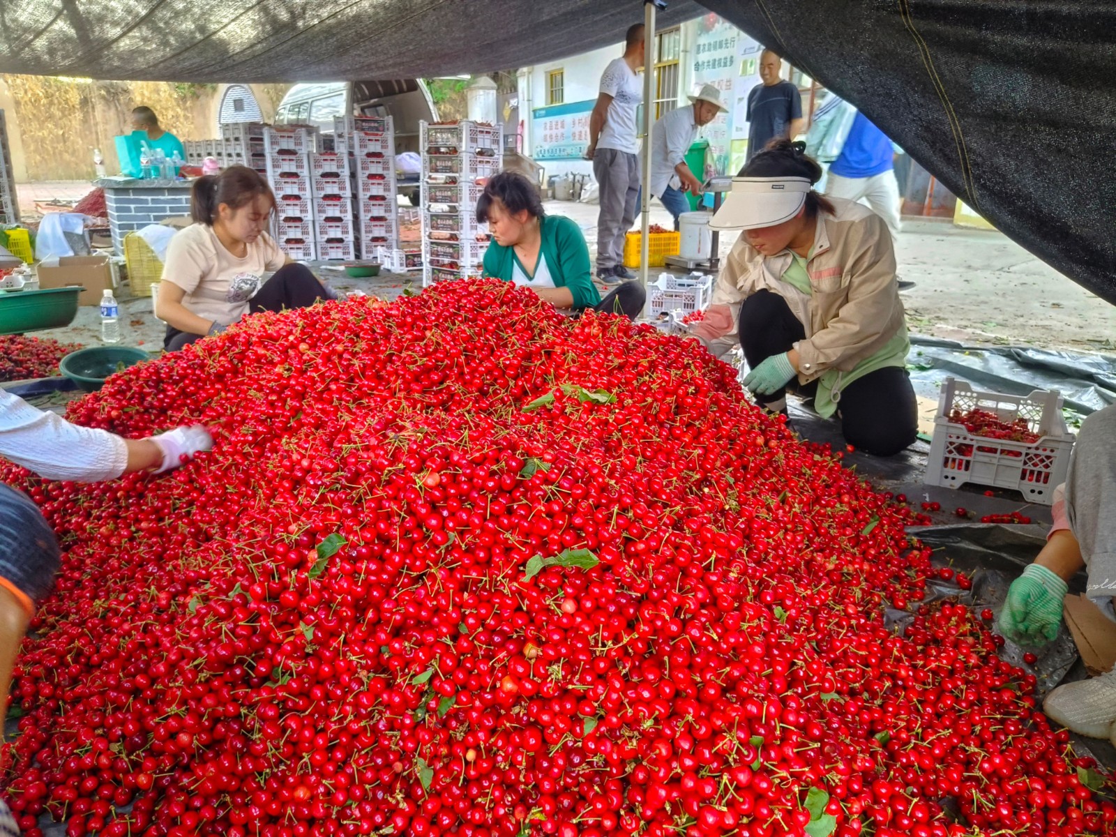 在集中收购点,客商正组织工人在樱桃堆前分拣、装箱,准备连日运输到外地进行销售。邮政、顺丰等快递公司也纷纷走进樱桃园,设置多个寄送点为果农提供快捷的樱桃邮寄服务,大樱桃搭乘“快车”驶向全国各地。