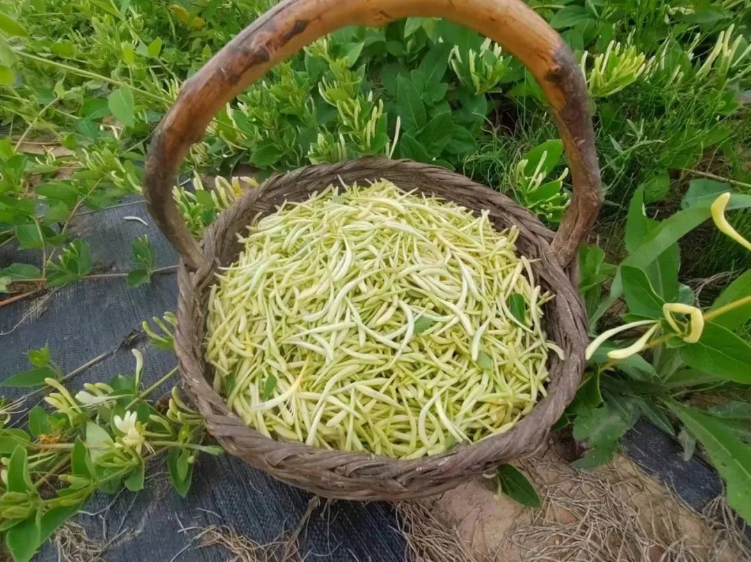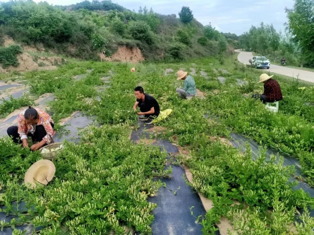 眼下,正是金银花盛开的时节,村民们在忙着采收金银花,随处可见一簇簇的金银花苞压坠枝头,淡淡的花香弥漫在空气中,沁人心脾,村民们边说笑边采摘,十分热闹。