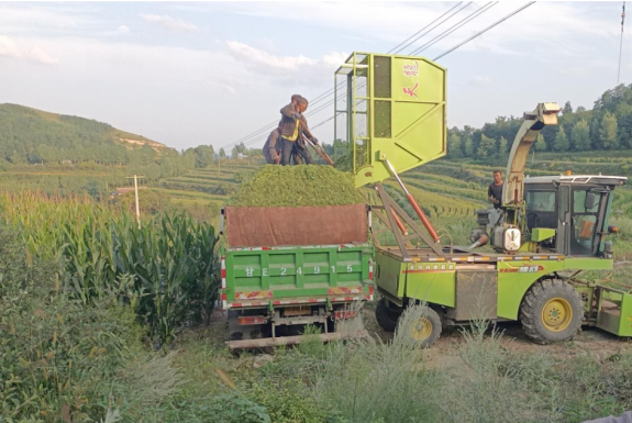 在松树镇大庄村饲草玉米种植示范点,机器轰鸣,玉米青贮收割机正忙着进行青贮作业,把一排排成熟的青贮玉米连果实带枝叶“大口吞进”,经过切碎和揉搓,变成青贮饲料从排料口“吐出”,装进与它并肩前进的卡车中,之后经过实压、密封、发酵等程序后,变成越冬牲畜贮备的“营养饲料”。