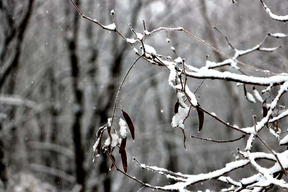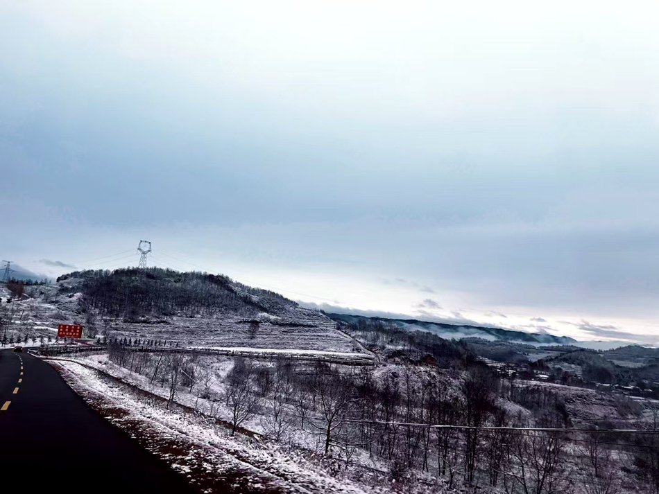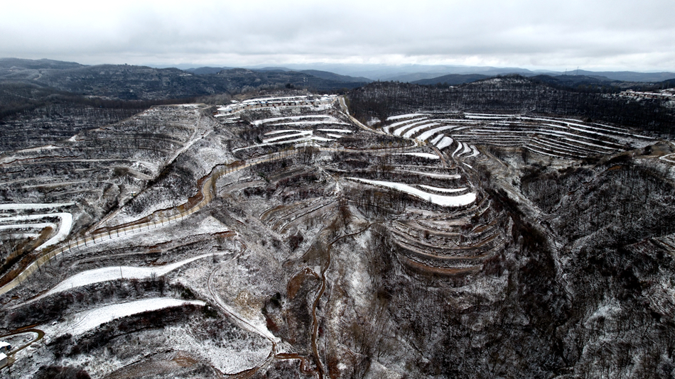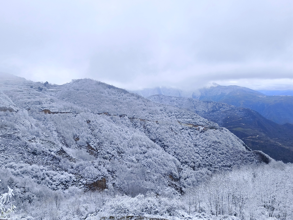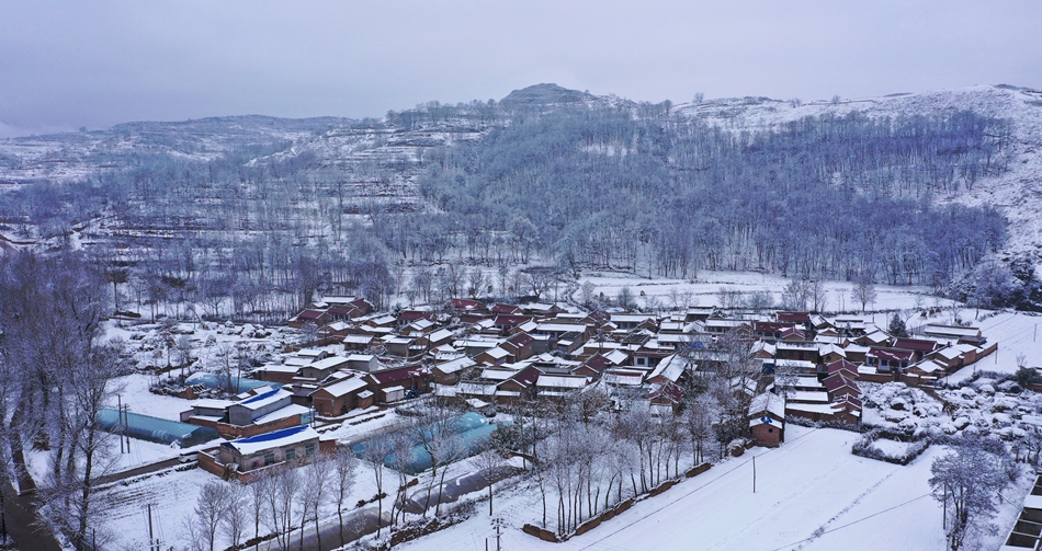 山峦枝头被白雪覆盖,山岭肌理映衬得格外清晰,料峭冬寒在此刻分外明显,山川村落融入皑皑冬雪,宁静且安逸。