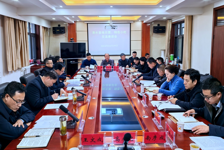 12月19日,清水县召开地方菜、特色小吃交流座谈会。县政协主席蔡俊杰,县委常委、副县长曲俊强,县人大常委会副主任陈登峰,县政协副主席李国桢出席会议。