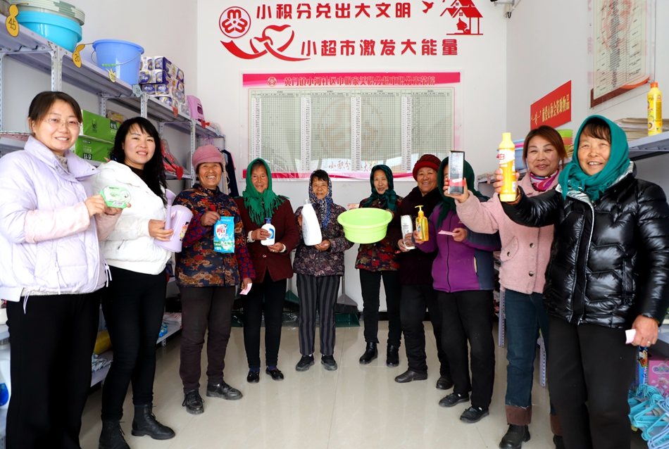 “一瓶洗洁精10分”“一瓶洗头膏25分”“一条毛毯40分”……走进黄门镇小河社区的“巾帼家美积分超市”,货架上整齐地摆放着可以兑换的各类生活用品,墙上贴着群众的积分公示牌,前来兑换积分的村民们排起了长队。
