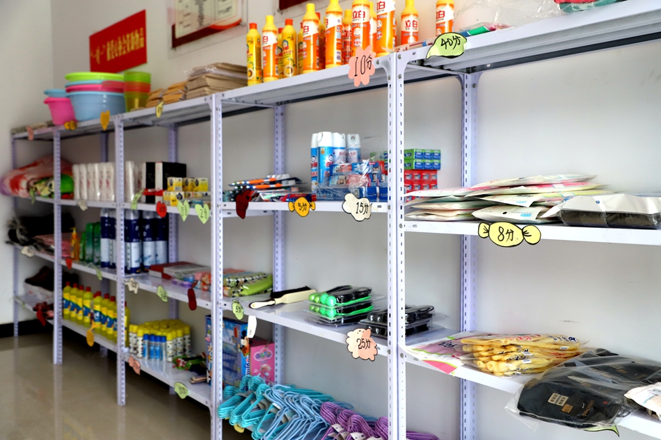 在社区工作人员的指引下,村民们有序统计积分、签字确认、挑选兑换心仪的生活用品。“家里洗洁精用完了,我今天过来再兑一瓶。”“这个洗头膏很好用,推荐你们兑回家试试”,村民们你一言、我一语,精挑细选自己可以兑换的物品,每位村民的脸上都洋溢着喜悦满足的笑容。