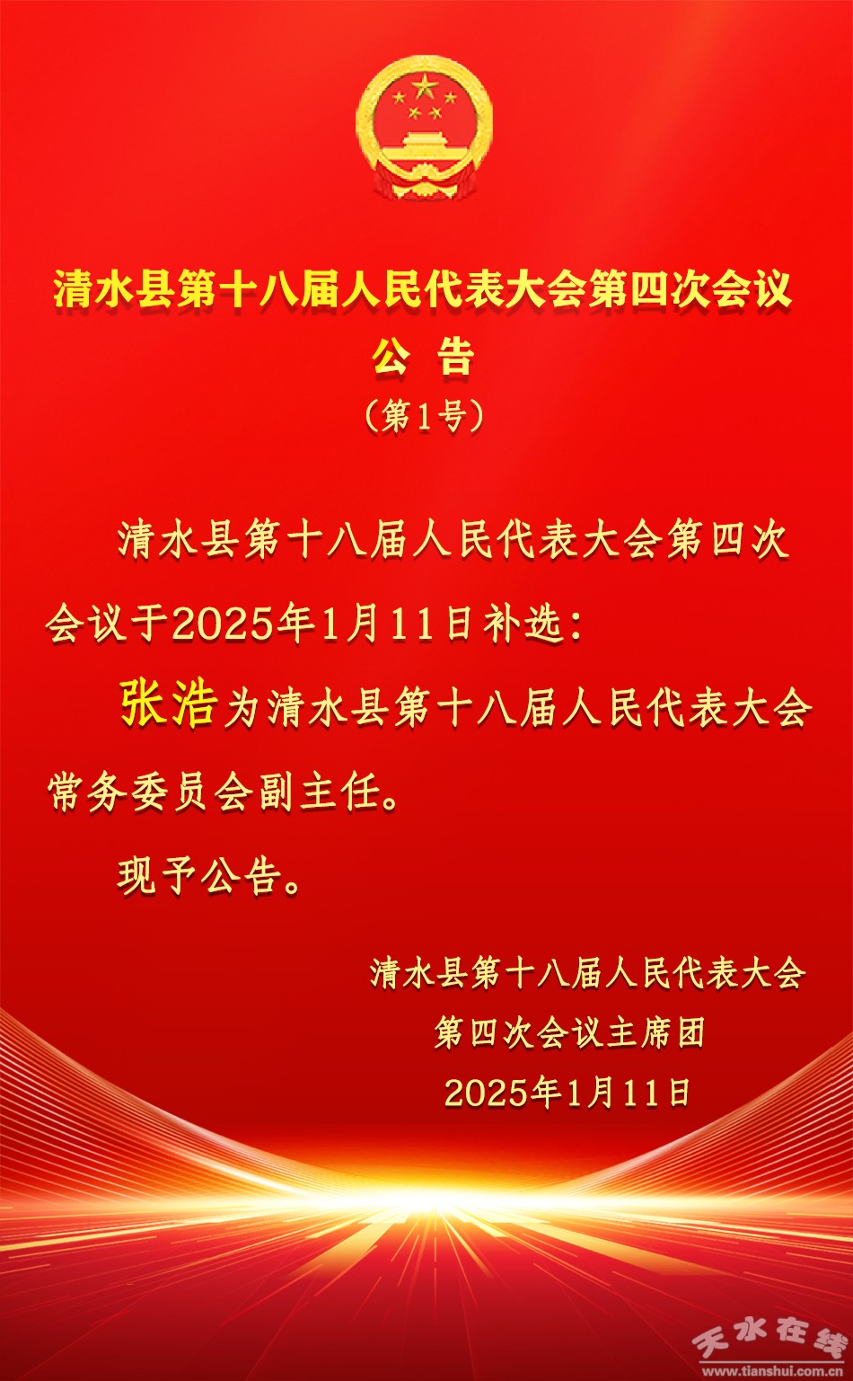 清水县第十八届人民代表大会第四次会议公告(第1号)