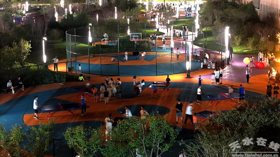 夜幕降临,公园里又是一番别样的景象。篮球场上,激烈的比赛正在上演,球员们你争我抢,每一次进球都引得观众阵阵欢呼;羽毛球场地里,轻盈的羽毛球在空中来回穿梭,乒乓球区域同样热闹,小小的乒乓球在球桌上来回跳跃,儿童区天真无邪的笑声回荡在公园上空,家长们则坐在一旁的休息长椅上,看着孩子们玩耍,脸上洋溢着幸福的笑容。