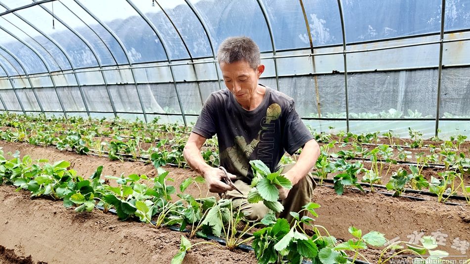 不远处的草莓种植区又是另一番忙碌的景象。种植户黄志辉和老婆正弯腰在冬暖式大棚里栽植草莓苗。草莓苗叶片翠绿、根系饱满,每栽一株都要仔细调整间距,再用手将根部周围的土壤轻轻压实。
