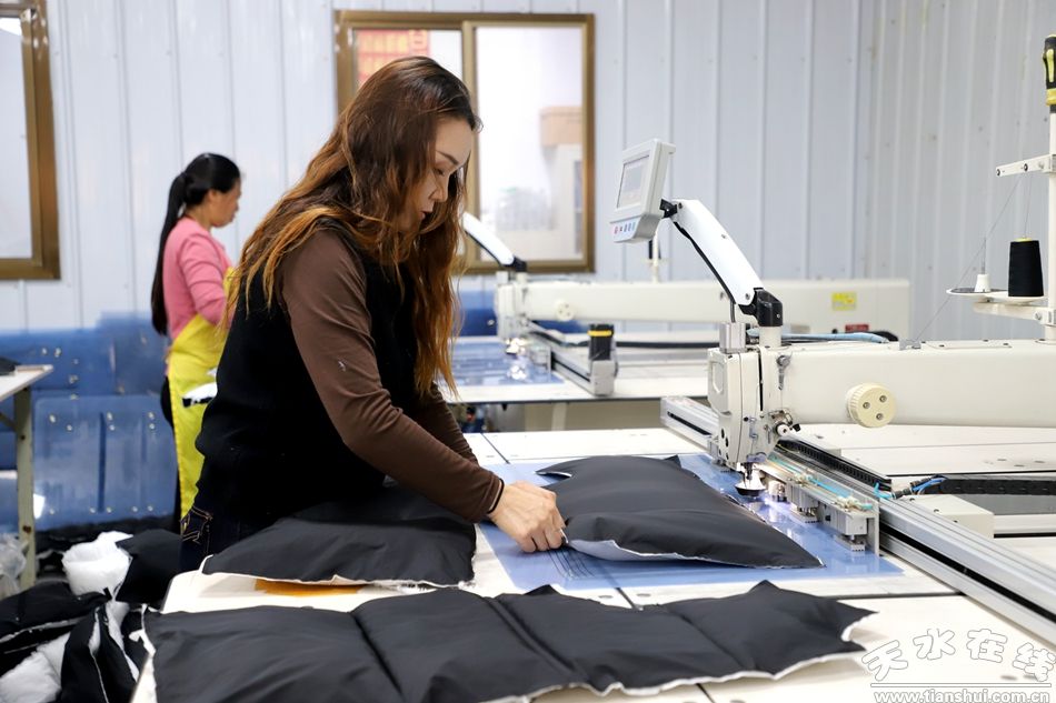 与此同时,佳纺服装企业同样发展得红红火火。走进生产车间,机器轰鸣,工人们各司其职,忙着缝纫、裁剪、包装。车间主要生产工装、校服和家纺产品,通过引进先进设备和优化生产流程,产能稳步提升,已成为清水县解决就业的又一重要力量。