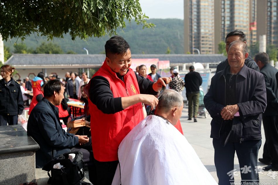 “大爷您坐好,想剪个清爽点的发型不?”义剪摊位前,理发师志愿者阿昌正细致地为老人梳理头发。推子贴着发梢平稳移动,剪刀在指尖灵活翻飞,碎发顺着围布落在地上,不一会儿,原本有些凌乱的头发便变得整齐利落。“剪得精神!过节就得有个新模样。”刚理完发的王大爷满意地点头。