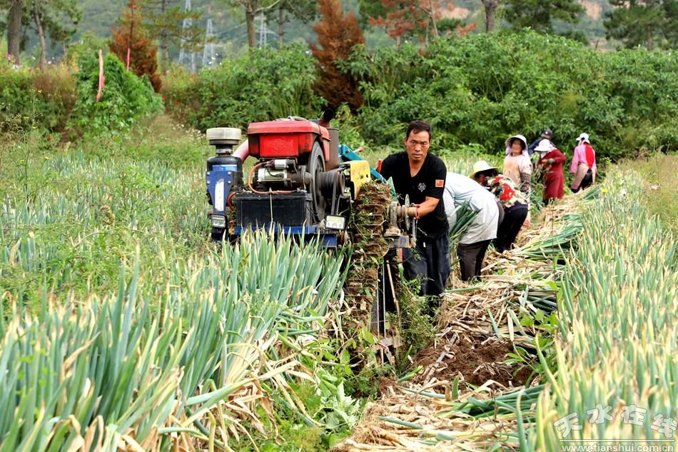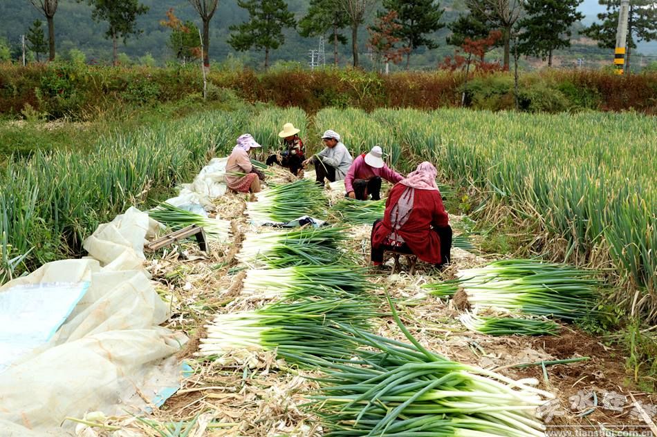 时下,正是大葱收获的季节,在清水县永清镇的大葱田野里,成片大葱挺拔葱翠,浓郁葱香弥漫四野,几十名工人正忙着收葱、扎捆、搬运、装车,一车车新鲜大葱整装待发,呈现出一派丰收景象。