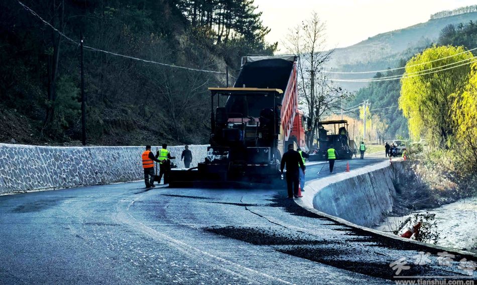 清水县交通局农村公路项目管理办公室副主任高斌说:“清水县X201线张棉至温沟(温沟段)养护工程项目全长8.43公里,起点位于温泉第一门处,路线途经王家庄、温泉村、汤峪村,终点止于汤浴水库,项目总投资3491万元。共分两个标段:第一标段正在进行油面铺设,预计11月中旬完工;第二标段进行水泥稳定基层铺设,预计明年4月底全面完工。”