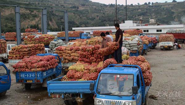 来自五县两区交售等外品苹果的车辆汇聚一地