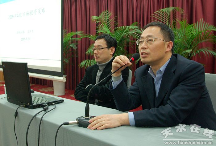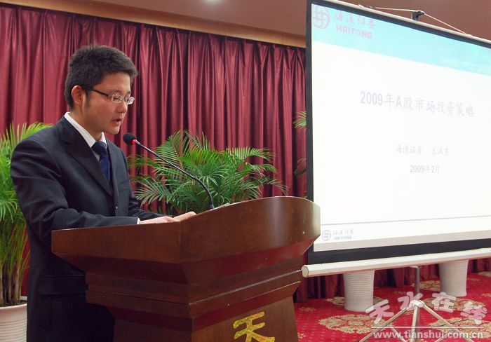2009年的中国证券市场,正从去年持续大跌的阴霾中逐渐觉醒,成为全球金融危机尚未见底的资本市场里的“一枝独秀”。但是,在我国经济发展速度明显下行、国家经济宏观调控政策趋向扩大内需的经济态势下,作为投资者如何把握住每一次投资机会,这既是广大投资者最为关心的话题,也是海通证券天水服务部秉承一切为了客户之宗旨的核心内容之一。基于此,海通证券天水服务部特邀海通证券总部投资理财中心投资总监王汉东先生亲临天水,围绕实盘操作,深入解析09年市场运行规律、指名投资方向,挖掘投资机会。据了解,毕业于上海财经大学经济学硕士的王汉东,现任海通证券总部投资理财中心投资总监,注册会计师(CPA),是中国证监会核准的首批投资咨询执业人员,拥有14年证券从业经验,具有150多家上市公司调研经验,具备广泛的行业投研渠道积累,丰富的实战经验,市场思路敏捷,善于挖掘潜力公司及转折性企业的投资机会。