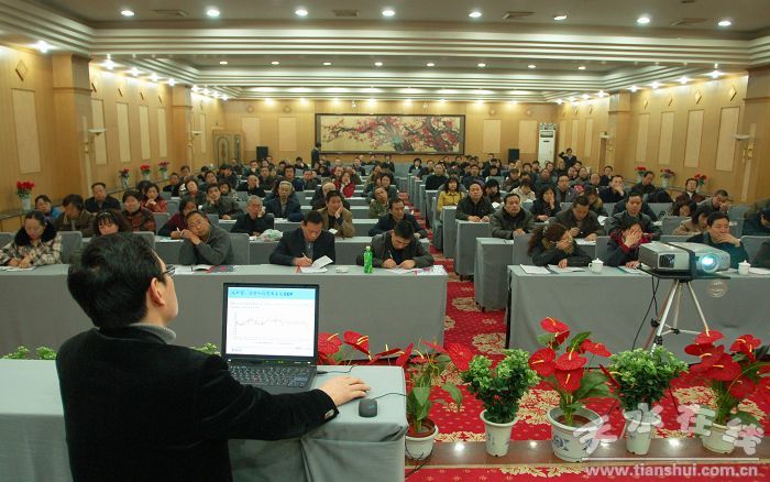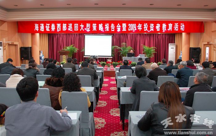 3月7日下午,天水市迎宾馆迎宾酒楼二楼会议室座无虚席。海通证券西部巡回大型策略报告会暨2009年投资者教育活动正在这里隆重举行。海通证券投资理财中心投资总监王汉东先生为我市广大投资者上了生动的一课。