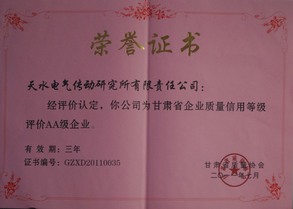 7月2日至3日,甘肃省质量兴企、质量诚信建设和名牌战略推进大会在兰州召开,会议公布了2009年和2010年全省企业质量信用等级评定结果,长城电工系统天水长城开关厂有限公司、天水二一三电器有限公司和天水电气传动研究所有限责任公司等三户全资子公司获AA级质量信用等级。