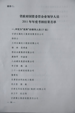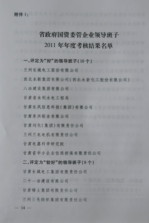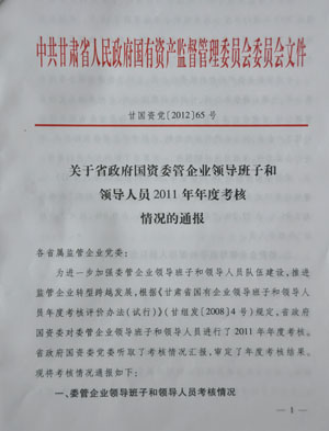 4月17日,省政府国资委党委下发《关于省政府国资委管企业领导班子和领导人员2011年年度考核情况的通报》(甘国资党发[2012]65号),对省政府国资委管企业领导班子和领导人员2011年年度考核结果进行了通报。
