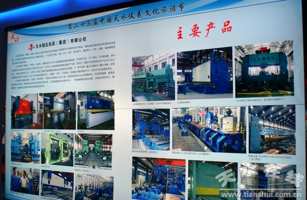 第一届天水装备制造业精品展览会展出天水锻压机床(集团)有限公司产品有QC11K-6×3200 数控剪板机、W67Y-63/3200折弯机,QA28Y-4×200A角度剪切机。其中,QC11K-6×3200 数控剪板机适用于汽车制造、机械、建材、电气、五金,航空航天等金属板材加工行业,在设计和制造上符合我国机电产品标准和安全标准。机床的开发、设计、制造和售后服务通过了ISO9001:2000质量体系认证。W67Y-63/3200折弯机是一种完成金属板料折弯机的通用设备,可以折制一定几何形状的工件,若更换不同模具、可以得到各种复杂截面形状的工件。如配备相应的工艺装备,还可以做剪切、冲槽、浅拉伸、冲孔之用。QA28Y-4×200A角度剪切机,是1989年引进国外最新技术研制出的一种新型液压可变角度切口机,其特点是剪切角度范围大,精度高(±10?),速度快,结构紧凑,体积小,操作方便,不需安装,接电源即可使用。适用于仪器仪表、电器、轻工、机床行业加工各种箱体、壳罩、角度样板等。