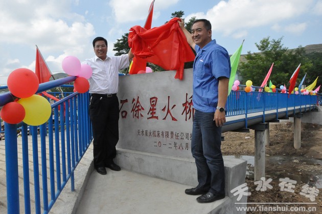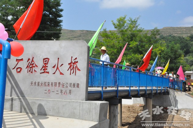 联村联户架起便民桥,为民富民开通致富路。 8月8日,星火机床公司为帮扶联系点-----天水市秦州区天水镇石徐村捐建的石徐星火桥(原星火连心桥)竣工典礼在石徐村举行。星火机床集团公司董事长李维谦,党委书记、集团公司副总经理王永革,星火机床公司工会副主席蒋俊,物业公司经理吴献军,天水镇党委书记安志成,天水镇党委副书记付伟,天水建筑勘察设计院所长卫世华等领导及广大村民出席典礼。天水镇党委副书记、镇长许祖熙主持典礼。