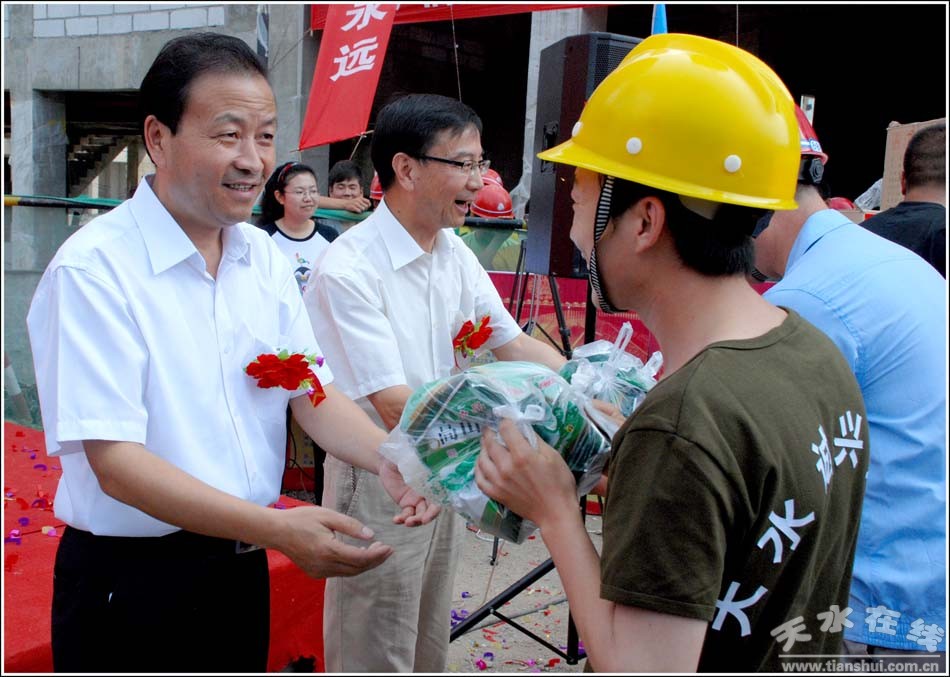 (市领导为建筑工人赠送冰糖和茶叶等慰问品)