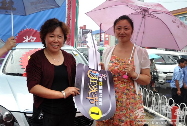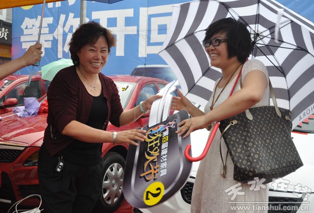 (天水桥南家居建材城总经理郑秀芳为中奖客户颁发车钥匙)