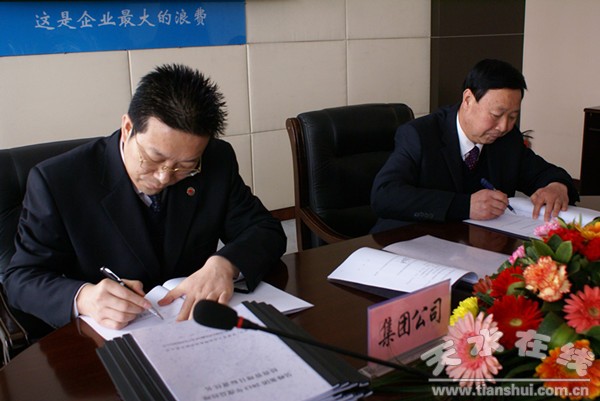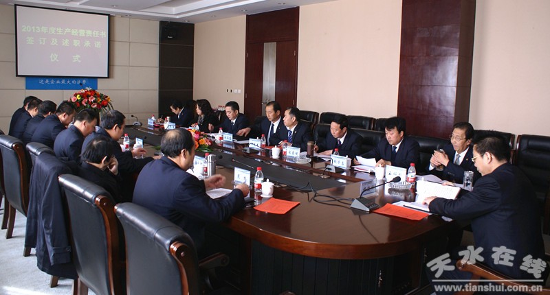 董事长与集团各副总、各单位17名负责人签定了2013年度目标管理责任书。随后,集团高管和各公司总经理就2013年企业管理和生产经营做了述职和承诺。
