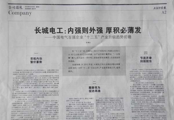 为了推动长城电工“十二五”快速发展,公司提出了长城电工“1215”发展战略:突出一个主业(电工电器产业)、发展两个产业(清洁能源产业和果汁产业)、设立一个园区(长城电工电器产业园)、建设五个基地(以长开厂公司为主体的高、中、低压成套开关设备和元件产业基地,充分发挥“长城”中国驰名商标的品牌影响力;以二一三公司为主体的低压电器元件和关键零部件产业基地,强化“二一三”中国驰名商标在元件领域的优势;以天传所公司为主体的自动化装置和新能源控制系统的产业基地;以长控公司为主体的母线槽和特种电器产业基地和以电力装备公司为主体的清洁能源产业基地)。通过项目建设,公司三大产业“十二五”末,公司的目标是形成电工电器主业年销售收入40亿元的市场规模,清洁能源和果蔬汁板块分别达到5亿元的年销售额。